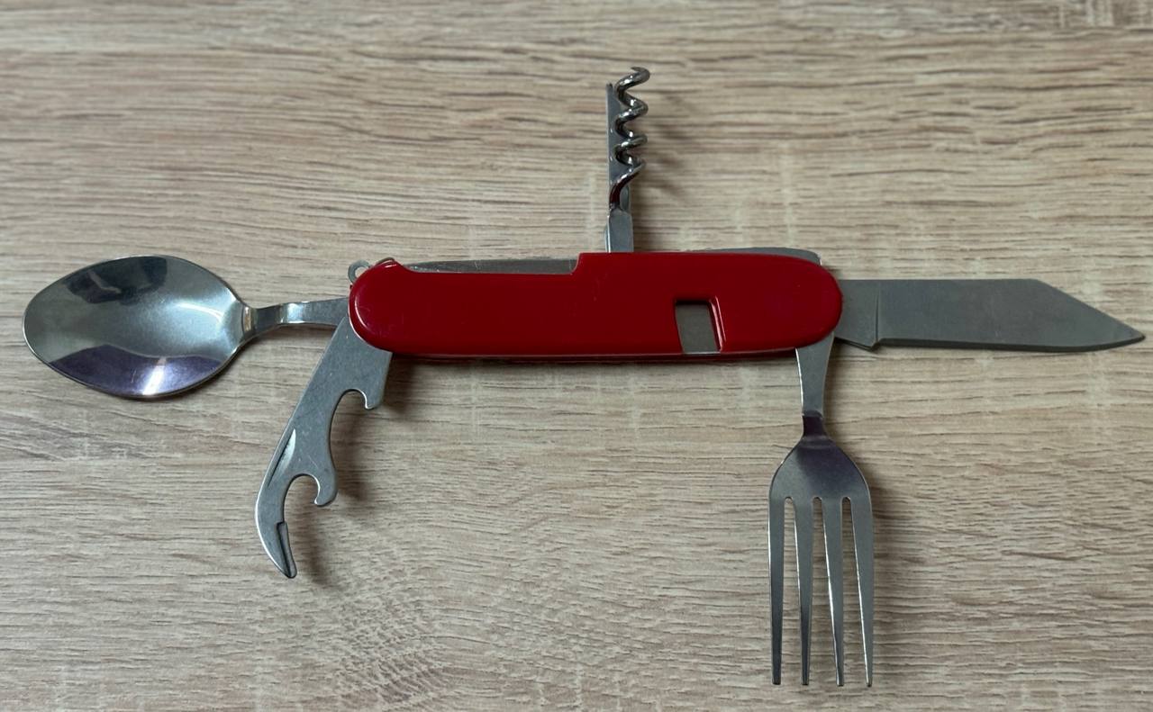 Представляем вашему вниманию инновационное решение для тех, кто ценит практичность и компактность в каждой детали — многофункциональный набор, объединяющий основные столовые приборы и полезные инструменты в одном эргономичном корпусе. Этот универсальный предмет станет незаменимым спутником в кемпинге, на рыбалке, в походе, во время пикника или в любой ситуации, когда доступ к полноценной кухне ограничен, предоставляя все необходимое для комфортного приема пищи и выполнения мелких бытовых задач.